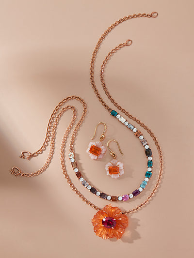 Carved Mandarin Garnet and Rubellite Tropical Flower Rose Gold Necklace